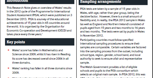 Mae’r Nodyn Ymchwil hwn yn rhoi trosolwg ar ganlyniadau Cymru yng nghylch 2012 y Rhaglen Ryngwladol Asesu Myfyrwyr (PISA) a gyhoeddwyd ar 3 Rhagfyr 2013. Arolwg o gyraeddiadau addysgol disgyblion 15 oed mewn 65 gwlad ledled y byd yw PISA. Fe’i trefnir gan y Sefydliad ar gyfer Cydweithrediad a Datblygiad Economaidd (OECD) ac fe’i cynhelir bob tair blynedd.