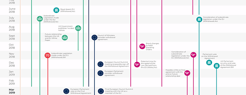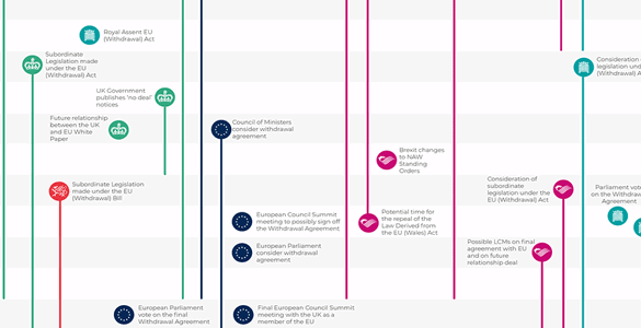 Ym mis Ebrill 2017, cyhoeddodd y Gwasanaeth Ymchwil ei llinell amser gyntaf ar gyfer Brexit, gyda'r nod o amlinellu'r digwyddiadau allweddol yn y trafodaethau ar ymadawiad y DU â'r UE, ynghyd â pharatoadau domestig ar gyfer ymadawiad y DU dros gyfnod y trafodaethau o 24 mis. Wrth gyhoeddi'r llinell amser gyntaf honno, fe wnaethom ymrwymo i ddiweddaru a datblygu'r llinell amser wrth i'r trafodaethau fynd yn eu blaen.