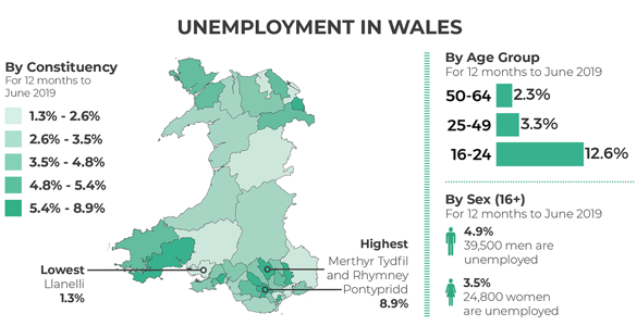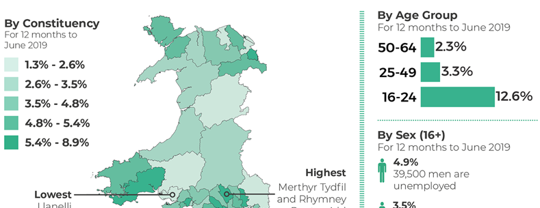 Ffeithlun yn dangos y ffigurau diweddaraf am y farchnad lafur yng Nghymru.
