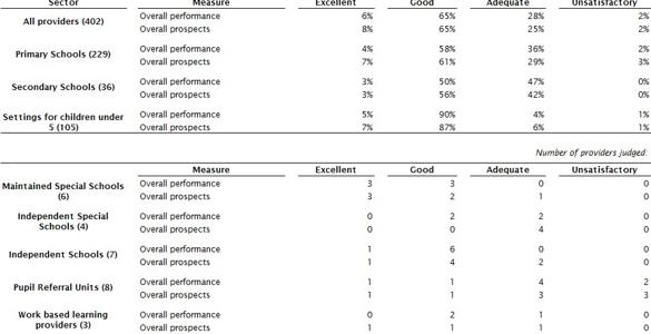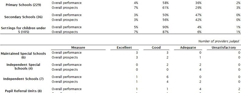 - Mae’n ymddangos bod tuedd am i lawr yn ystod y cylch arolygu presennol. Yn 2010/11, roedd perfformiad 80% o’r ysgolion a arolygwyd yn Rhagorol neu’n Dda, ond mae hyn wedi gostwng i 62%.