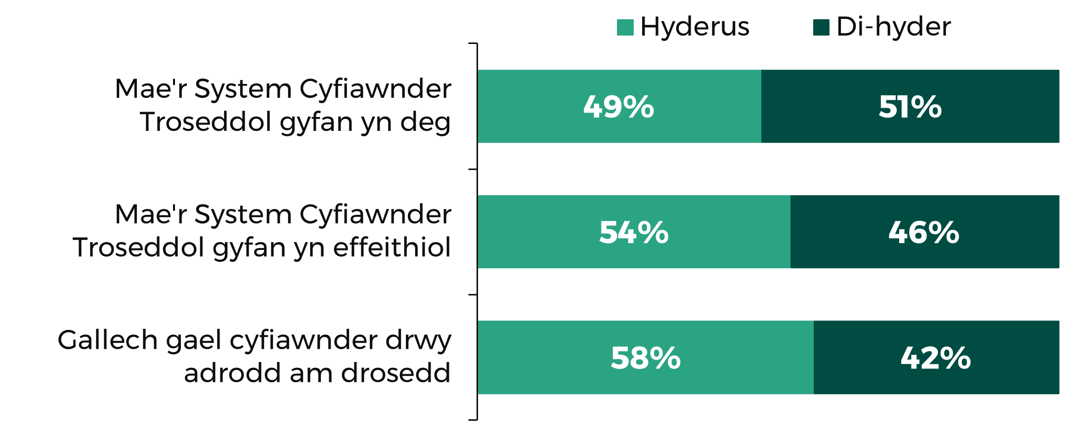 - Hyder mewn erlyn: mynegodd tua hanner yr ymatebwyr hyder isel y byddai Gwasanaeth Erlyn y Goron yn erlyn yn effeithiol, gyda rhai yn nodi eu bod yn teimlo nad oeddent yn cael eu credu neu’n cael eu diystyru.