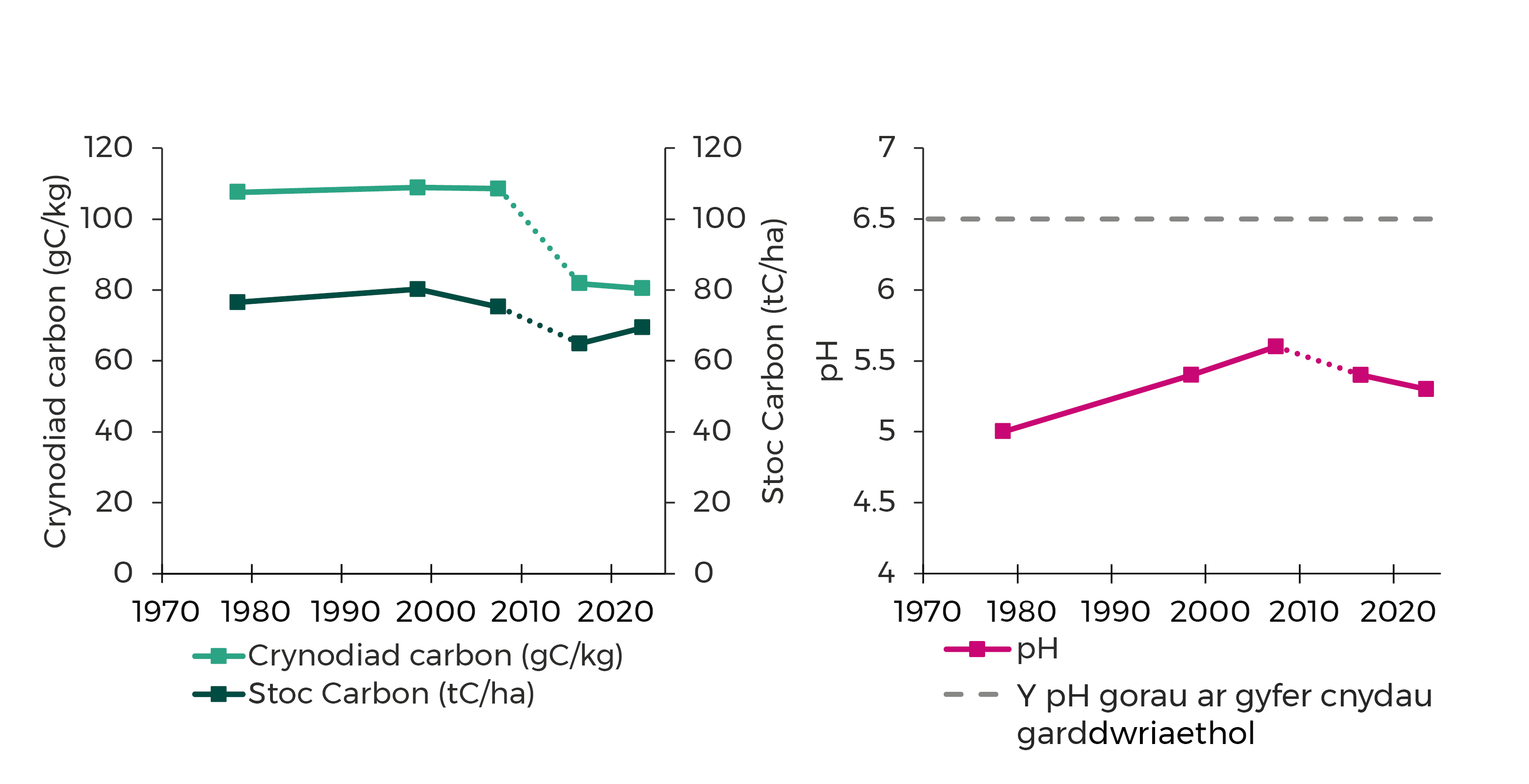 Ffynhonnell: ERAMMP, Nodwch fod pwyntiau o 1978 i 2007 wedi'u cofnodi fel rhan o'r Arolwg Cefn Gwlad Cymru, y pwynt yn 2015 yw'r cyfartaledd o'r Rhaglen Monitro a Gwerthuso Glastir (GMEP) (2013 i 2016) a'r pwynt olaf yn 2023 yw'r cyfartaledd ar gyfer pob dangosydd o fonitro ERAMMP ei hun (2021 i 2023). Mae'r llinell doredig yn dangos tuedd bosibl yn seiliedig ar ddata presennol ar gyfer cyfnodau o amser lle mae bylchau data yn digwydd. Oherwydd dyluniadau rhaglenni tebyg, gellir cymharu canlyniadau'r 10 mlynedd diwethaf (GMEP ac ERAMMP) â'r rhai o'r Arolwg Cefn Gwlad hanesyddol
