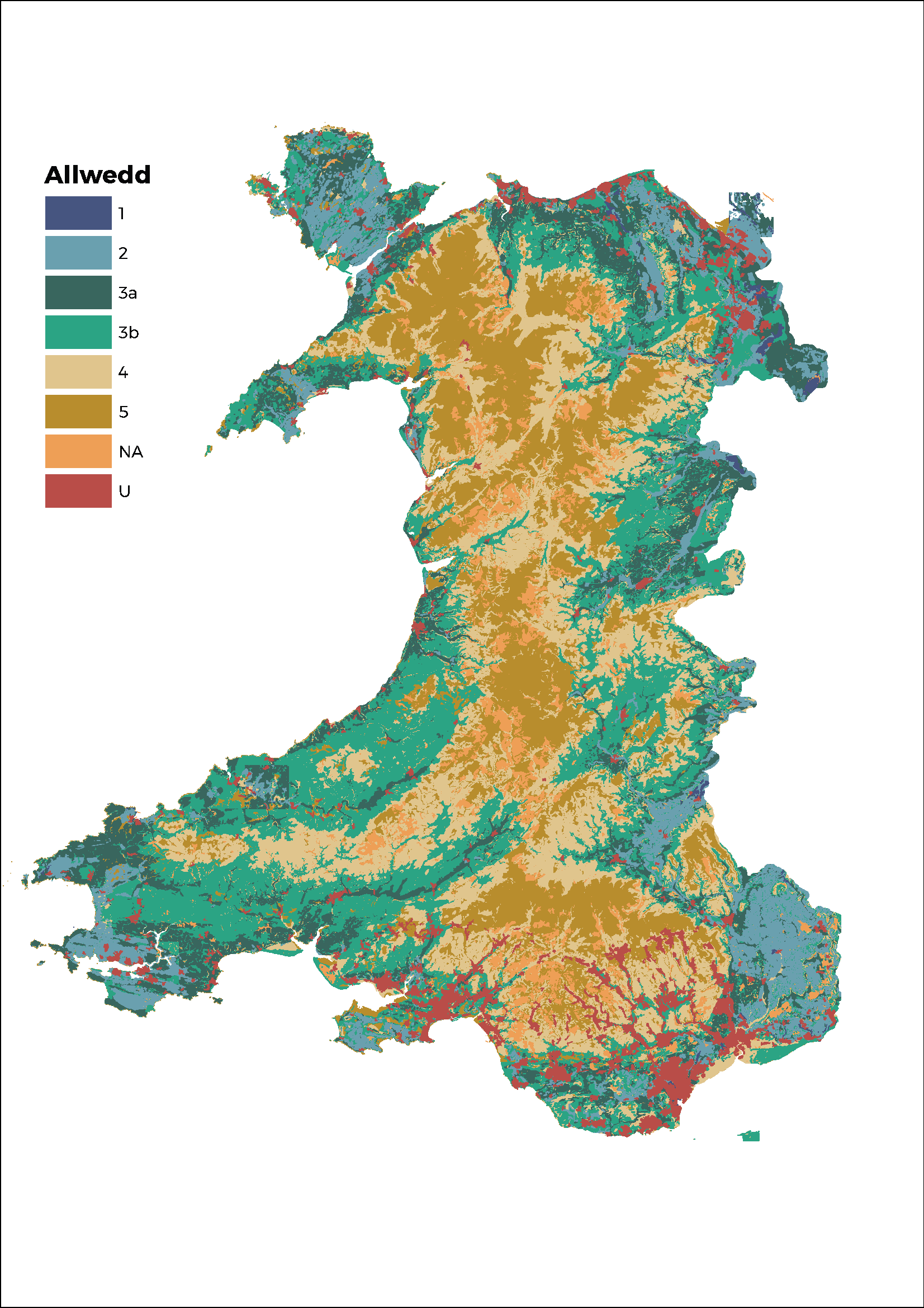 Ffynhonnell: MapDataCymru, Mae'r allwedd yn dangos graddau Dosbarthiad Tir Amaethyddol. Mae NA yn dynodi tir nad yw’n dir amaethyddol ac mae U yn dynodi tir trefol.