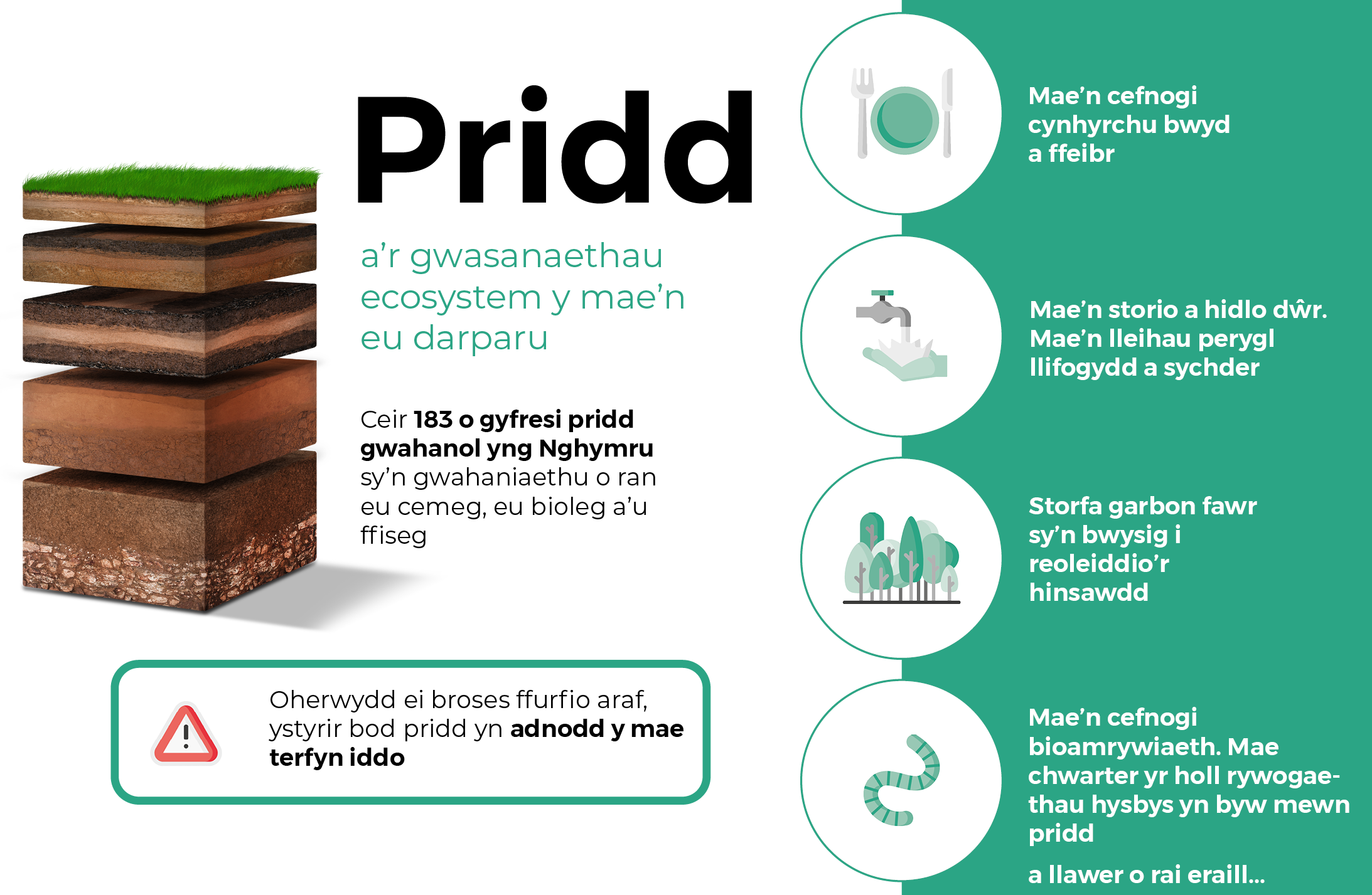Mae pridd yn chwarae rhan bwysig mewn cynhyrchu bwyd, atal llifogydd a storio carbon, ond nid yw'n adnodd adnewyddadwy. Dim ond 10-15% o dir Cymru sydd â phridd o ansawdd uchel ar gyfer tyfu ac mae llawer o hyn yn agored i ddiraddiant. Er bod rhai camau gweithredu wedi bod gan Lywodraeth Cymru i ddiogelu priddoedd Cymru, mae llawer o randdeiliaid yn gofyn am amddiffyniadau pellach.