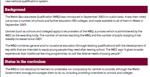 Mae’r Hysbysiad Hwylus hwn yn nodi’r hyn a gaiff ei gynnwys ar hyn o bryd ym Magloriaeth Cymru a beth fydd yn newid ym mis Medi 2015 pan gaiff fersiwn newydd o’r cymhwyster ei chyflwyno. Mae hyn yn dilyn argymhelliad o adolygiad annibynnol Huw Evans o gymwysterau ar gyfer pobl ifanc 14 i 19 oed yng Nghymru y dylid sefydlu Bagloriaeth Cymru newydd, ddiwygiedig a mwy trylwyr wrth wraidd system gymwysterau ddiwygiedig Cymru.