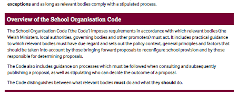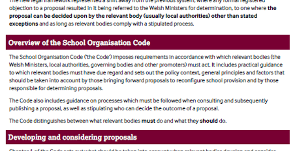Mae'r Hysbysiad Hwylus hwn yn nodi'r gofynion cyfreithiol sy’n berthnasol i awdurdodau lleol a chyrff eraill sy’n gwneud cynigion ar gyfer ad-drefnu ysgolion (fel cau neu uno ysgolion) a'r gweithdrefnau y mae'n rhaid eu dilyn. Newidiwyd y broses gan ddeddfwriaeth y Cynulliad yn 2013 a chan ganllawiau Llywodraeth Cymru yn dilyn hynny (y Cod Trefniadaeth Ysgolion). Roedd y camau hyn yn symudiad tuag at sefyllfa lle byddai’r awdurdodau lleol eu hunain, yn hytrach na Llywodraeth Cymru, yn gwneud y penderfyniadau terfynol, ar wahân i eithriadau a nodwyd.