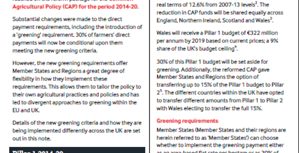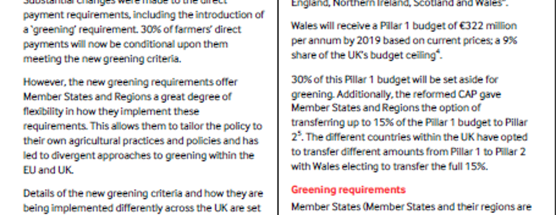 Roedd diwygio’r Polisi Amaethyddol Cyffredin (PAC) yn cynnwys cyflwyno gofyniad ‘gwyrddu’ newydd. Mae’r gofynion gwyrddu newydd yn cynnig cryn dipyn o hyblygrwydd ac mae hyn wedi arwain at ddulliau gweithredu gwahanol ar wyrddu. Ceir manylion am y meini prawf gwyrddu newydd a sut y cânt eu rhoi ar waith mewn ffyrdd gwahanol ledled y DU yn y nodyn hwn.