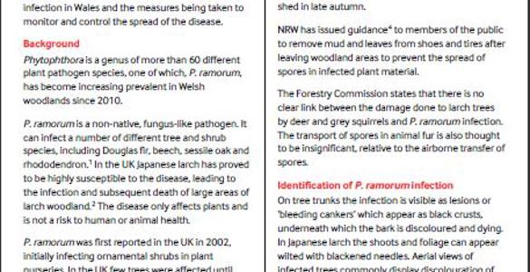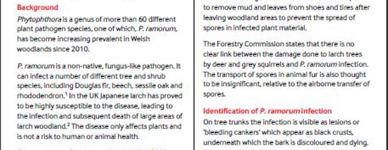 Mae'r nodyn ymchwil hwn yn rhoi crynodeb o hyd a lled yr haint Phytophthora ramorum (P. ramorum) yng Nghymru a'r camau sy'n cael eu cymryd i fonitro a rheoli lledaeniad y clefyd.