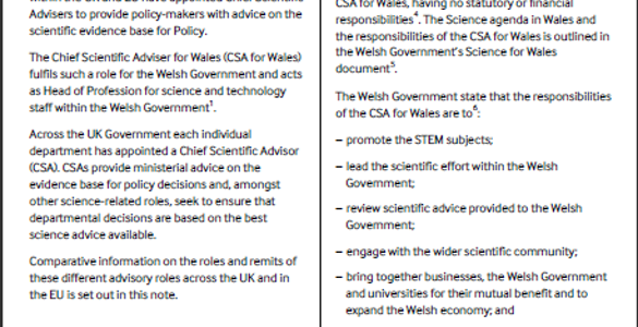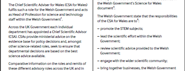 Penodir Prif Gynghorwyr Gwyddonol (CSA) i roi cyngor i wneuthurwyr polisi ar y sail dystiolaeth wyddonol ar gyfer Polisi. Mae Prif Gynghorydd Gwyddonol Cymru (CSA Cymru) yn cyflawni rôl o'r fath i Lywodraeth Cymru. Nodir gwybodaeth gymharol am rolau a chylchoedd gwaith y rolau cynghori gwahanol yn y DU ac yn yr UE yn y nodyn hwn.
