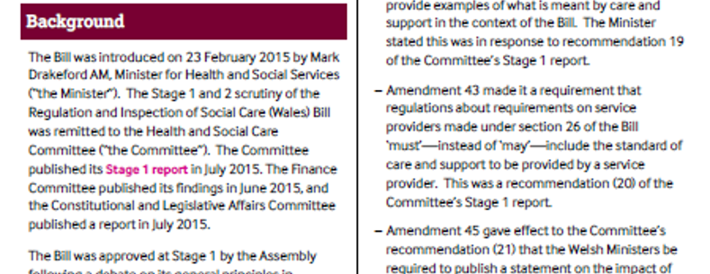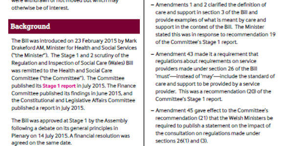 Mae’r ddogfen hon yn nodi rhai o’r prif newidiadau a wnaed i’r Bil Rheoleiddio ac Arolygu Gofal Cymdeithasol (Cymru) ("y Bil") yn ystod trafodion Cyfnod 2. Mae hefyd yn rhestru rhai gwelliannau nas cynigiwyd neu a gafodd eu tynnu'n ôl a allai, er hynny, fod o ddiddordeb.