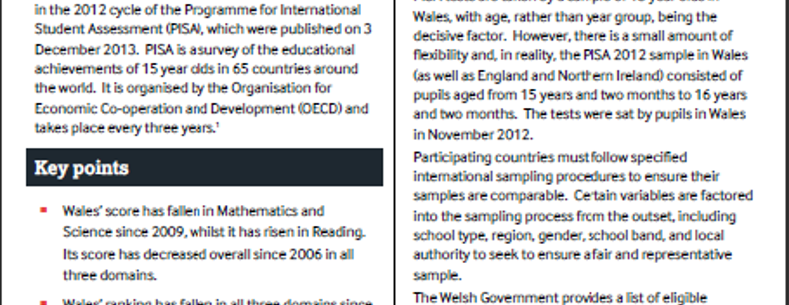 Mae’r Nodyn Ymchwil hwn yn rhoi trosolwg ar ganlyniadau Cymru yng nghylch 2012 y Rhaglen Ryngwladol Asesu Myfyrwyr (PISA) a gyhoeddwyd ar 3 Rhagfyr 2013. Arolwg o gyraeddiadau addysgol disgyblion 15 oed mewn 65 gwlad ledled y byd yw PISA. Fe’i trefnir gan y Sefydliad ar gyfer Cydweithrediad a Datblygiad Economaidd (OECD) ac fe’i cynhelir bob tair blynedd.