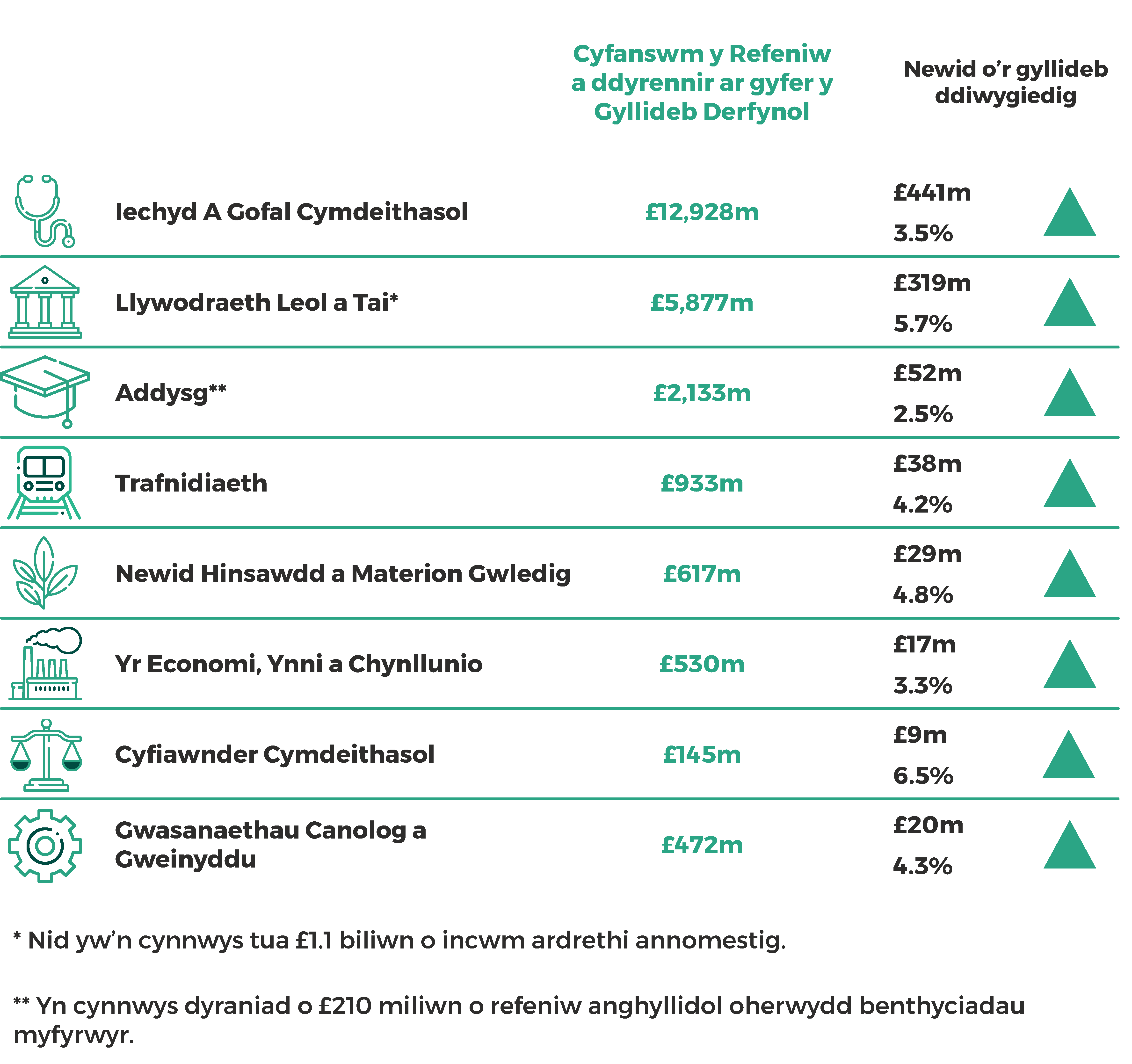 Mae cymharu'r cyfanswm refeniw a ddyrannwyd yn y Gyllideb Derfynol â'r llinellau sylfaen diwygiedig ar gyfer 2025-26 yn dangos bod y cynnydd nominal mwyaf ar gyfer Iechyd a Gofal Cymdeithasol, sef £441m, a’r cynnydd canrannol mwyaf ar gyfer Cyfiawnder Cymdeithasol (cynnydd o 6.5%, neu £9m, o gymharu â'r llinell sylfaen ddiwygiedig). Fodd bynnag, mae dyraniadau pob adran wedi cynyddu 2.5% neu fwy. Mae ein ffigurau'n cynnwys dyraniadau nad ydynt yn arian parod.