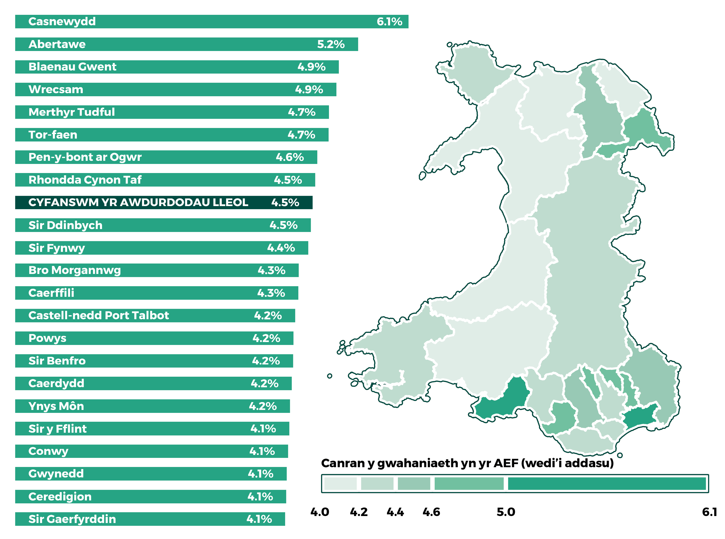 Casnewydd sydd â’r cynnydd canrannol mwyaf mewn cyllid ar gyfer awdurdod lleol unigol (6.1%). Casnewydd hefyd oedd â'r cynnydd canrannol uchaf y llynedd.