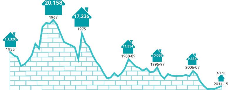 Ym 1955, adeiladwyd dros 70% o'r holl gartrefi newydd gan y sector cyhoeddus. Drigain mlynedd yn ddiweddarach, mae'r sefyllfa fel arall, gyda dros 80% o gartrefi newydd yn cael eu hadeiladu gan y sector preifat.