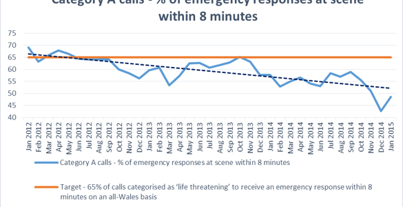 Ledled Cymru, roedd amseroedd ymateb ambiwlansys o fewn 8 munud 1.3 pwynt canran yn brin o'r targed o 65% yn 2012, (ffigurau cyfartalog ar gyfer mis Ionawr i fis Rhagfyr), 9.4 pwynt canran yn 2013, a 10.6 pwynt canran yn 2014.