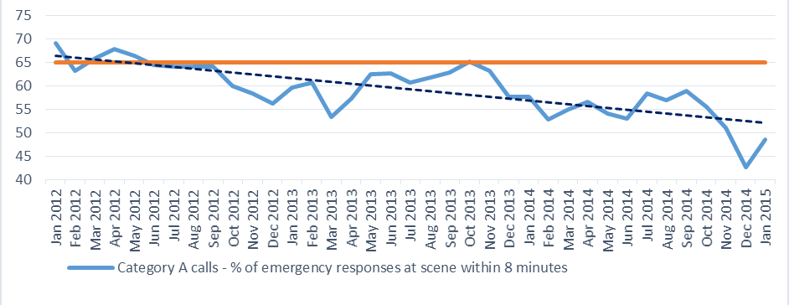 […] a very limited way of judging and incentivising the performance of ambulance services. Speed is particularly important for some conditions such as cardiac arrest but there is little clinical evidence to support the blanket 8 minute national target.Roedd Ymddiriedolaeth Gwasanaethau Ambiwlans Cymru yn cyrraedd y targedau hyn yn ystod hanner cyntaf 2012, ond ers mis Mehefin 2012, dim ond unwaith y mae wedi cyrraedd y targed o 65%, sef ym mis Hydref 2013. Mae'r graff canlynol yn dangos sut y mae canran yr ymatebion brys sy'n cyrraedd o fewn 8 munud wedi aros yn gyson is na'r targed o 65%, a bod tuedd gyffredinol i'r amser ymateb ostwng: