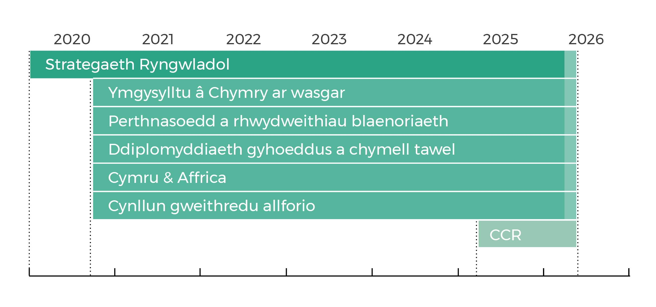 Er 2020, mae Llywodraeth Cymru wedi cyflwyno chwe chynllun yn ymwneud â chysylltiadau rhyngwladol. Maent wedi bod ar waith ar yr un pryd ond mae ganddynt hyd oes wahanol, fel y mae'r ffeithlun isod yn ei ddangos.