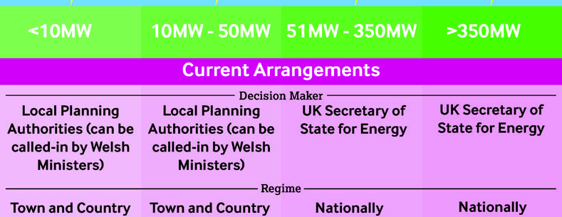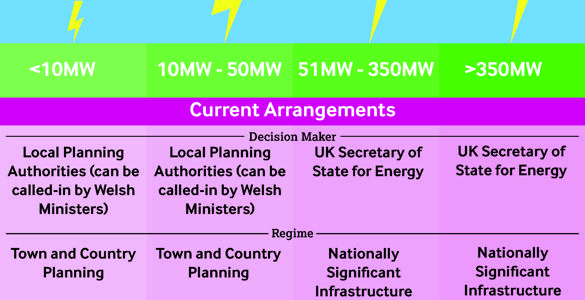 is-ddeddfwriaeth a basiwyd gan y Cynulliad ar 26 Ionawr 2016 yn cynnwys yr holl orsafoedd cynhyrchu ynni ar y tir rhwng 10 a 50 Megawat yn y diffiniad o Ddatblygiadau o Arwyddocâd Cenedlaethol. Ar hyn o bryd, caiff penderfyniadau ynghylch gorsafoedd cynhyrchu dros 50 Megawat eu gwneud gan Lywodraeth y DU.