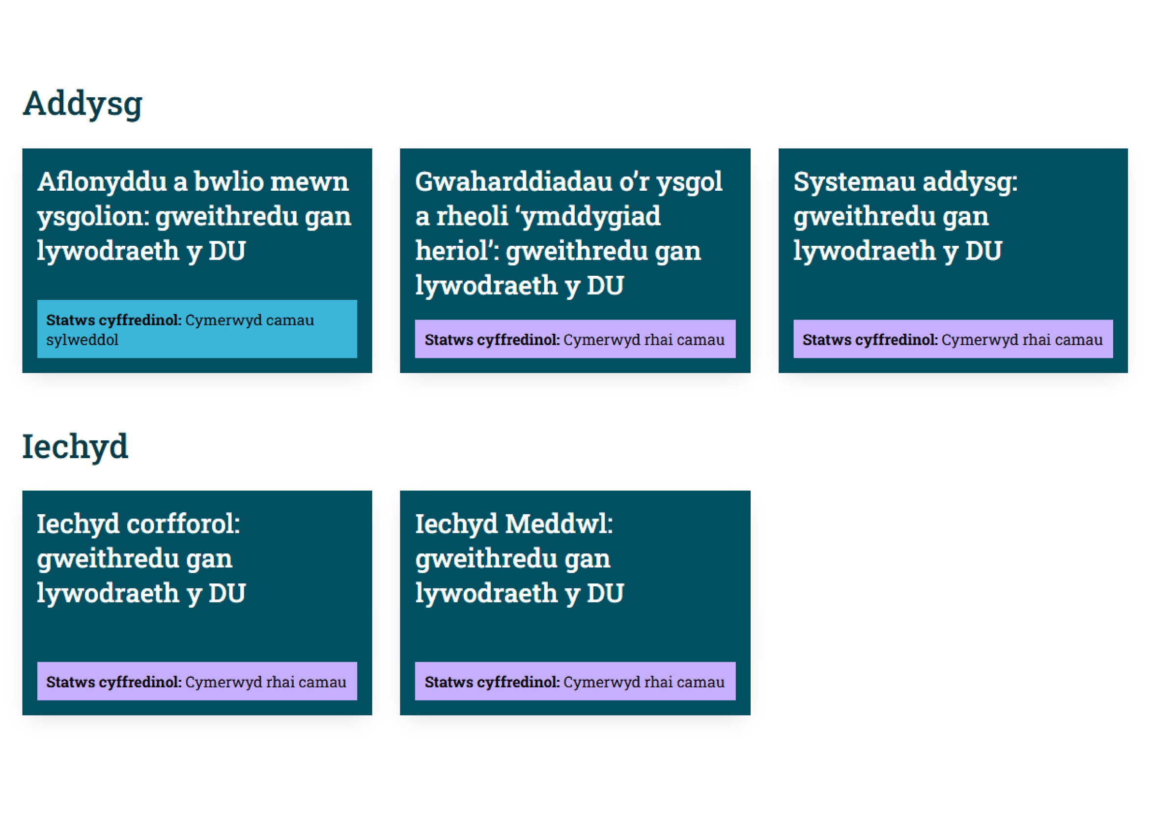 Gall Aelodau’r Senedd a’r gymdeithas sifil wirio beth sydd wedi’i wneud ar draws gwahanol feysydd thematig sy’n effeithio ar fywydau pobl bob dydd. Gallant hefyd weld yr holl argymhellion a wnaed i’r DU yn ystod adolygiadau cytuniadau’r Cenhedloedd Unedig er 2016 – sydd ar gael yn Gymraeg hefyd – a darganfod sut i gyfrannu at brosesau adolygu yn y dyfodol.