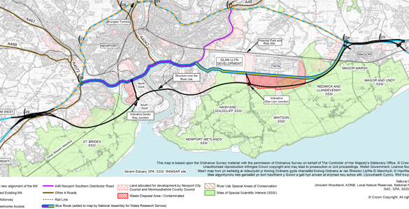 Y dyfodol Ym mis Mawrth 2016, cyhoeddodd Llywodraeth Cymru ddatganiad amgylcheddol y cynllun, gan nodi sut y bydd yn lliniaru'r effeithiau negyddol ar yr amgylchedd. Nid yw'n glir eto i ba raddau y mae’r datganiad hwn yn lleddfu’r pryderon amgylcheddol. Cyhoeddodd Llywodraeth Cymru hefyd ddeddfwriaeth ddrafft a oedd yn paratoi'r ffordd ar gyfer y gwaith adeiladu, ynghyd ag ystod o adroddiadau eraill. Ym mis Mai 2015, dywedodd y Prif Weinidog wrth y Pedwerydd Cynulliad y byddai'r cynllun yn costio dipyn yn llai na £1 biliwn. Er mai £857 miliwn yw’r amcangyfrif a geir o’r gost adeiladu yn y dogfennau newydd, gan gynnwys £45 miliwn ar gyfer gwaith ar yr amgylchedd a'r dirwedd, mae'r gwerthusiad economaidd yn amcangyfrif mai cyfanswm y gost fydd £1.131 biliwn, heb gynnwys TAW a chwyddiant. Yn dibynnu ar yr ymatebion i'r datganiad amgylcheddol a'r gorchmynion drafft, bydd angen i Lywodraeth newydd Cymru benderfynu a ddylid cynnal ymchwiliad lleol cyhoeddus, yn ôl pob tebyg yn ystod hydref neu aeaf 2017. Yn dibynnu wedyn ar adroddiad yr ymchwiliad hwnnw, byddai'n rhaid i’r Llywodraeth benderfynu a ddylid bwrw ymlaen. Pe bai’n gwneud hynny, ac oni bai bod her gyfreithiol i’r cynllun, gallai'r gwaith adeiladu ddechrau yn ystod gwanwyn 2018, gyda'r ffordd yn agor yn hydref 2021. Ffynonellau allweddol- CBI Cymru, Cynllun ar gyfer ffyniant (2015)