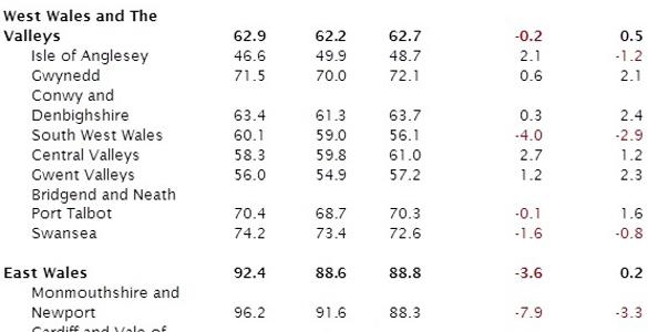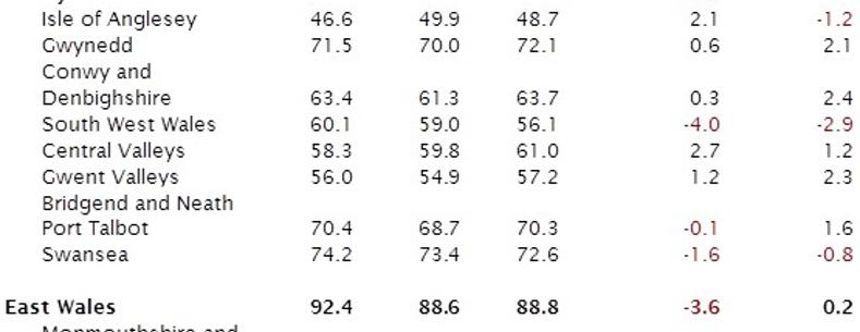 Dengys Tabl 1 y newidiadau yn y GYC ar sail y gweithle y pen ar gyfer Cymru, ac ardaloedd NUTS2 a NUTS3 Cymru, o gymharu â chyfartaledd y DU, dros y cyfnod llawn y mae'r ffigurau hyn ar gael. Dangosir newidiadau negyddol mewn coch.