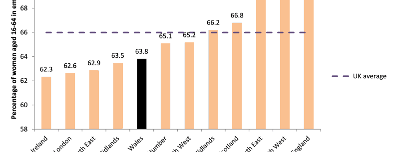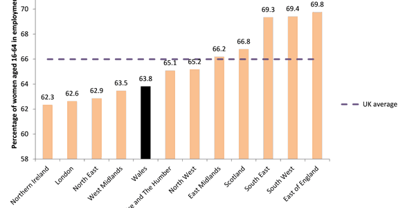 Rhwng mis Gorffennaf 2012 a mis Mehefin 2013, roedd 63.8% o fenywod rhwng 16 a 64 oed mewn cyflogaeth yng Nghymru, sef yr wythfed uchaf o blith y cenhedloedd datganoledig a rhanbarthau Lloegr, ac sy'n is na chyfartaledd y DU o 66%. Mae ffigur 1 yn dangos y ffigurau ar gyfer y cenhedloedd datganoledig a rhanbarthau Lloegr.