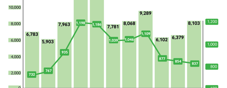 Mae’r graff yn dangos y newidiadau yn nifer yr achosion newydd o TB buchol mewn buchesi yng Nghymru yn ystod y deng mlynedd diwethaf, yn ogystal â nifer y gwartheg a gafodd eu difa yn yr un cyfnod. Cyrhaeddodd yr achosion newydd mewn buchesi eu hanterth yn 2008-09 gyda thuedd gyffredinol ar i lawr ers hynny. Mae nifer y gwartheg sydd wedi eu difa hefyd wedi gostwng ers 2009, ond mae’r ffigurau diweddaraf ar gyfer 2015 yn dangos cynnydd yn y nifer a gafodd eu difa ers 2014.