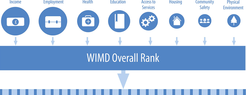 Ffynhonnell: Llywodraeth Cymru, Mynegai Amddifadedd Lluosog Cymru 2019 - Adroddiad canlyniadau (PDF, 8MB)