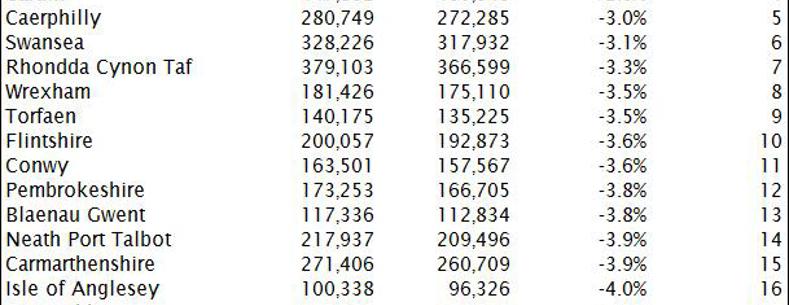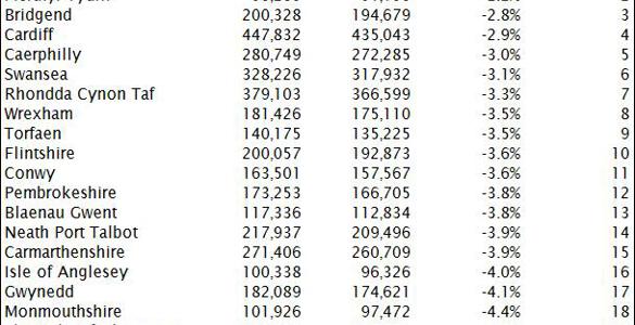 Mae’r gostyngiadau’n amrywio o doriad o 1.2% yng Nghasnewydd i doriad o 4.6% yn Sir Ddinbych, Ceredigion a Phowys.