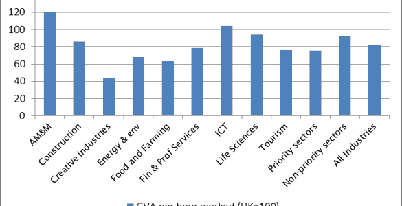 - Yn 2011, roedd y gwerth ychwanegol crynswth (GYC) fesul awr a weithiwyd (ffordd o fesur cynhyrchiant) yn uwch yn y sectorau blaenoriaeth nac yn y sectorau eraill (£27 o'i gymharu â £20). Y sector Gwasanaethau Proffesiynol a Chyllid oedd â'r GYC uchaf fesul awr a weithiwyd (£45) a'r Diwydiannau Creadigol oedd â'r isaf (£10).