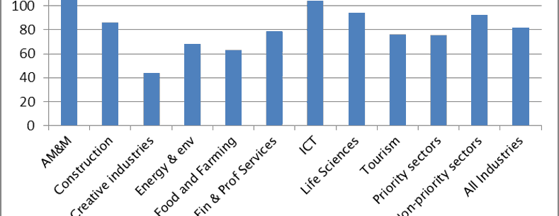 Ffigur 1: Cynhyrchiant Cymharol Sectorau Blaenoriaeth yng Nghymru, 2011 (DU=100)