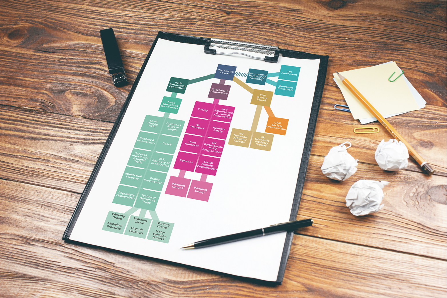 Mae’r Cytundeb Ymadael yn sefydlu wyth fforwm newydd rhwng y DU a’r UE. Y prif fforwm yw’r Cyd-bwyllgor a gefnogir gan chwe Phwyllgor Arbenigol ar y canlynol: