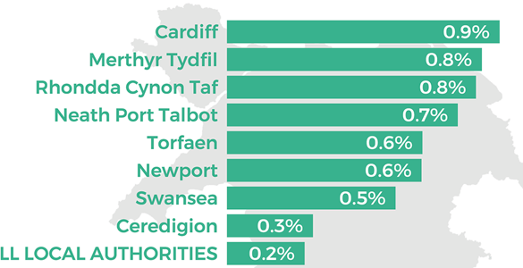 Y cynnydd mwyaf o'i gymharu â 2018-19 yw 0.9 y cant yng Nghaerdydd a'r gostyngiad mwyaf yw -0.3 y cant ar gyfer pum awdurdod lleol (Ynys Môn, Conwy, Sir y Fflint, Powys a Sir Fynwy).