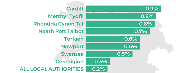 Y cynnydd mwyaf o'i gymharu â 2018-19 yw 0.9 y cant yng Nghaerdydd a'r gostyngiad mwyaf yw -0.3 y cant ar gyfer pum awdurdod lleol (Ynys Môn, Conwy, Sir y Fflint, Powys a Sir Fynwy).