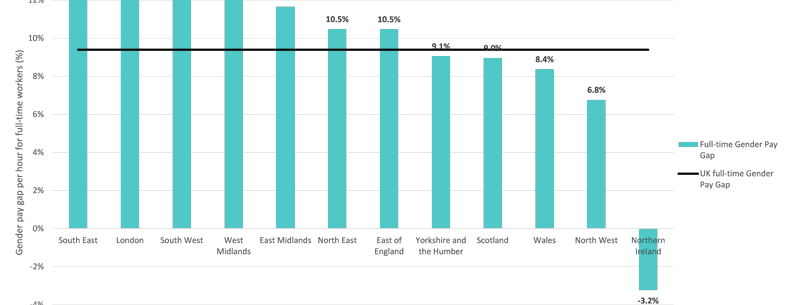 Ffigur 1: Bwlch cyflog rhwng y rhywiau ar gyfer gweithwyr amser llawn yn y gwledydd datganoledig a rhanbarthau Lloegr yn 2014