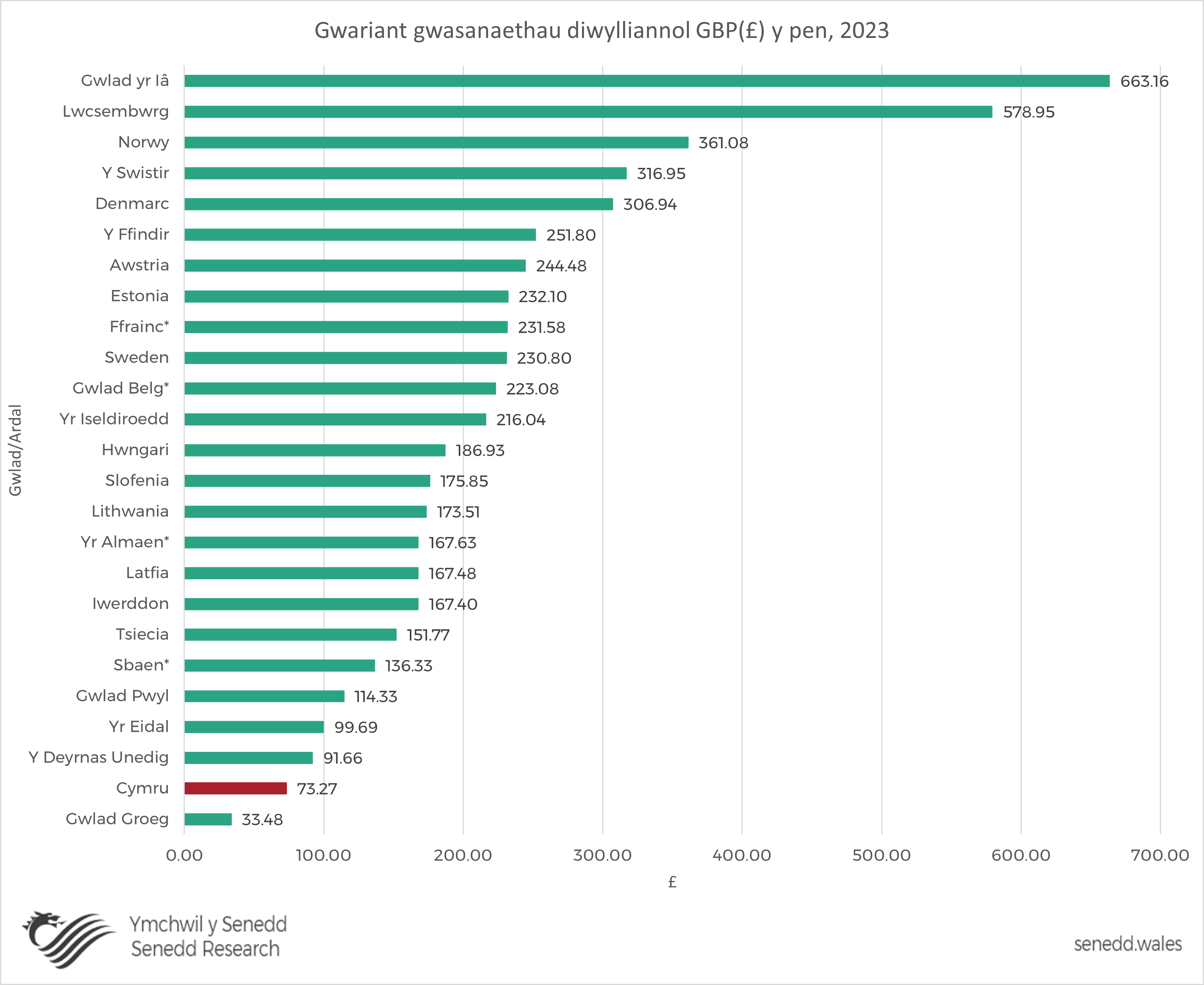 Y gwariant cyfartalog ar wasanaethau diwylliant yn y gwledydd hyn yw £223.85 y pen. Yng Nghymru, y ffigwr cyfatebol yw £73.27 y pen, sef 33% o’r ffigwr cyfartalog ar gyfer y gwledydd dan sylw. Golyga hyn fod Cymru yn y safle olaf ond un o blith y 25 gwlad ar y rhestr.