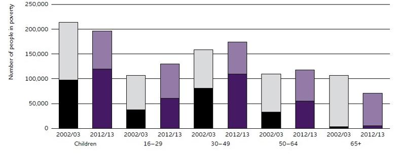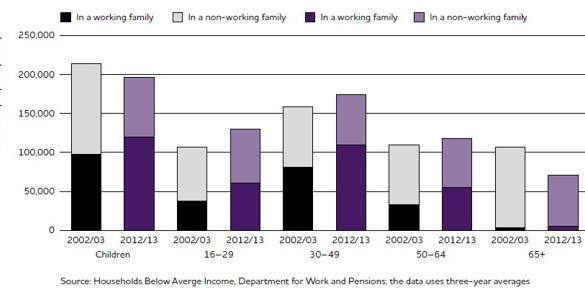 - o'i gymharu â deng mlynedd yn gynharach, fod mwy o bobl o oedran gweithio (yn enwedig oedolion ifanc) mewn tlodi a llai o blant a phensiynwyr. Mae tlodi wedi codi ymhlith teuluoedd sy'n gweithio ac wedi cwympo ymhlith teuluoedd di-waith;