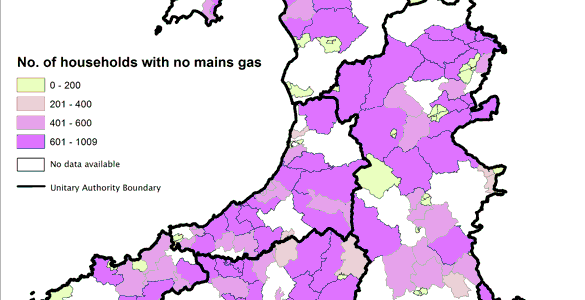 Mae'r map isod yn dangos y nifer amcangyfrifedig o gartrefi yn ôl Ardal Gynnyrch Ehangach Is Cyfrifiad 2011 nad oeddent wedi cysylltu â'r rhwydwaith nwy yn 2012. Er gwybodaeth, ar gyfer rhai Ardaloedd Cynnyrch Ehangach Is, nid oes data ar gael.