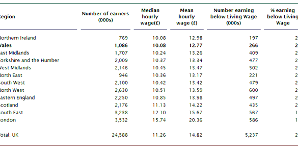 Fel y dengys y tabl isod, canfu astudiaeth mai Cymru sy’n ail ar y rhestr o ranbarthau'r DU â'r cyfrannau uchaf o weithwyr sy’n ennill llai na'r Cyflog Byw, gyda 25 y cant o'r rhai mewn cyflogaeth yn y categori hwnnw (Gogledd Iwerddon sydd ar frig y rhestr, gyda 26 y cant). Mae'r ffigur hwn 2 y cant yn uwch na'r ffigur ar gyfer y llynedd, sef 23 y cant.