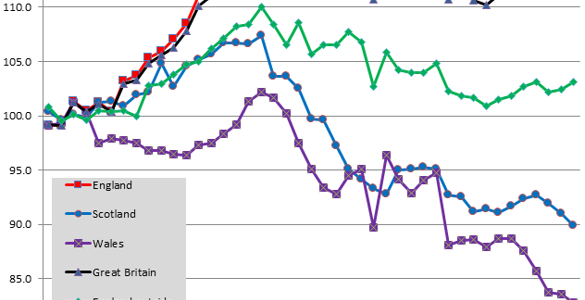 Ffigur 1: Teithiau teithwyr ym Mhrydain ar wasanaethau bysiau lleol yn ôl gwlad (Mynegai: 2004-05 = 100). Ffynhonnell: Cyfres Ystadegau Bysiau Yr Adran Drafnidiaeth, niferoedd teithwyr yn BUS0106 (nodiadau a diffiniadau o'r ystadegau hyn)