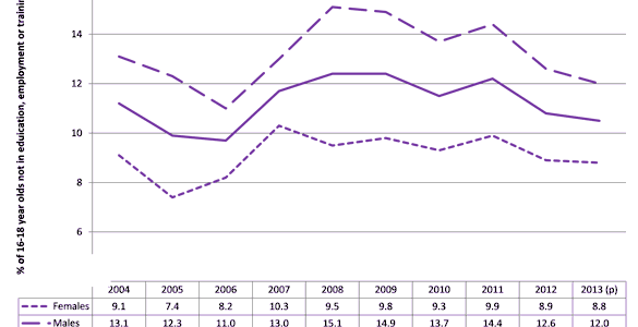 - Gostyngodd y gyfran o bobl ifanc 16-18 oed nad ydynt mewn addysg, cyflogaeth na hyfforddiant i 10.5% yn 2013 o gymharu â 10.8% yn 2012.