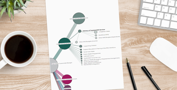 Y gwerthoedd a ddangosir yn y diagram a'r tabl yw refeniw, ynghyd â dyraniadau cyfalaf. Mae maint pob nod yn cael ei raddio yn ôl ei gyfran o lefel y gyllideb. Mae lliwiau gwahanol yn cynrychioli portffolios gwahanol.